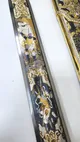 Клинки и ножны этого меча выполнены из драгоценных металлов: никеля, золота высшей пробы (толщина 10 мкм), а также украшены авторской ручной гравировкой. Детали, подчеркнутые техниками чернения, синения и эмали, добавляют мечу неповторимый шарм. Исключительное внимание к деталям не оставит равнодушным даже самого взыскательного заказчика.